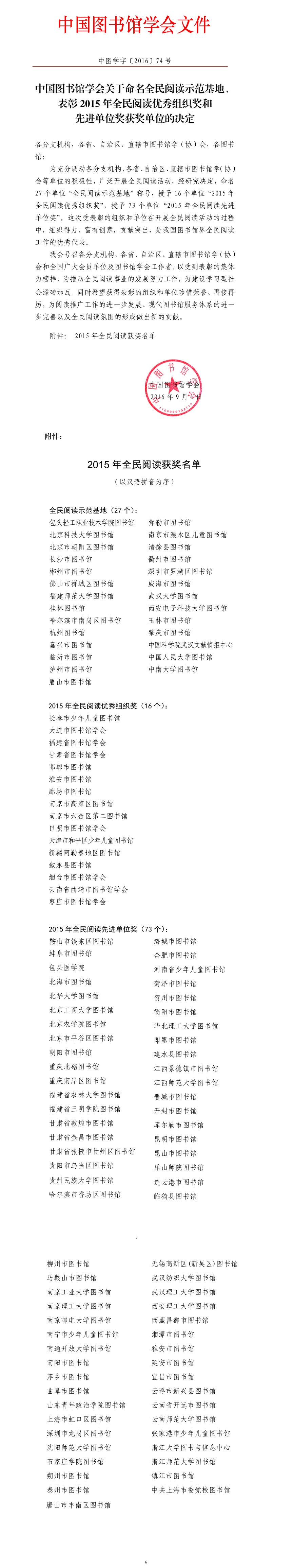 相关附件下载:中国图书馆学会关于命名全民阅读示范基地、表彰2015年全民阅读优秀组织奖和先进单位奖获奖单位的决定.doc