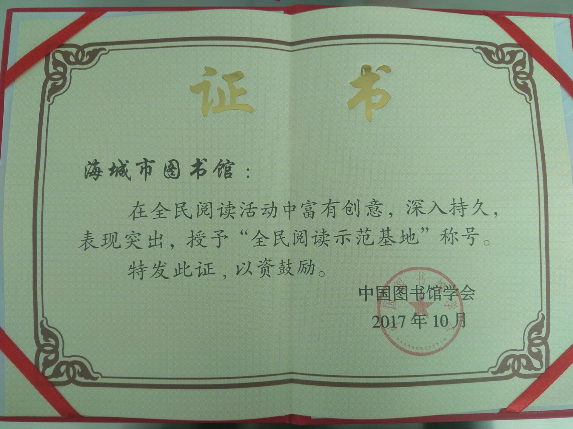 海城市图书馆在2016年全国全民阅读活动评选活动中喜获“全民阅读示范基地”称号。2012年以来海城市图书馆广泛在海城地区广泛开展全民阅读活动,2014年度、2015年度的全国全民阅读活动中已连续两年评选为“全国全民阅读先进单位”称号,此次2016度再次获得“全国全民阅读示范基地”殊荣。