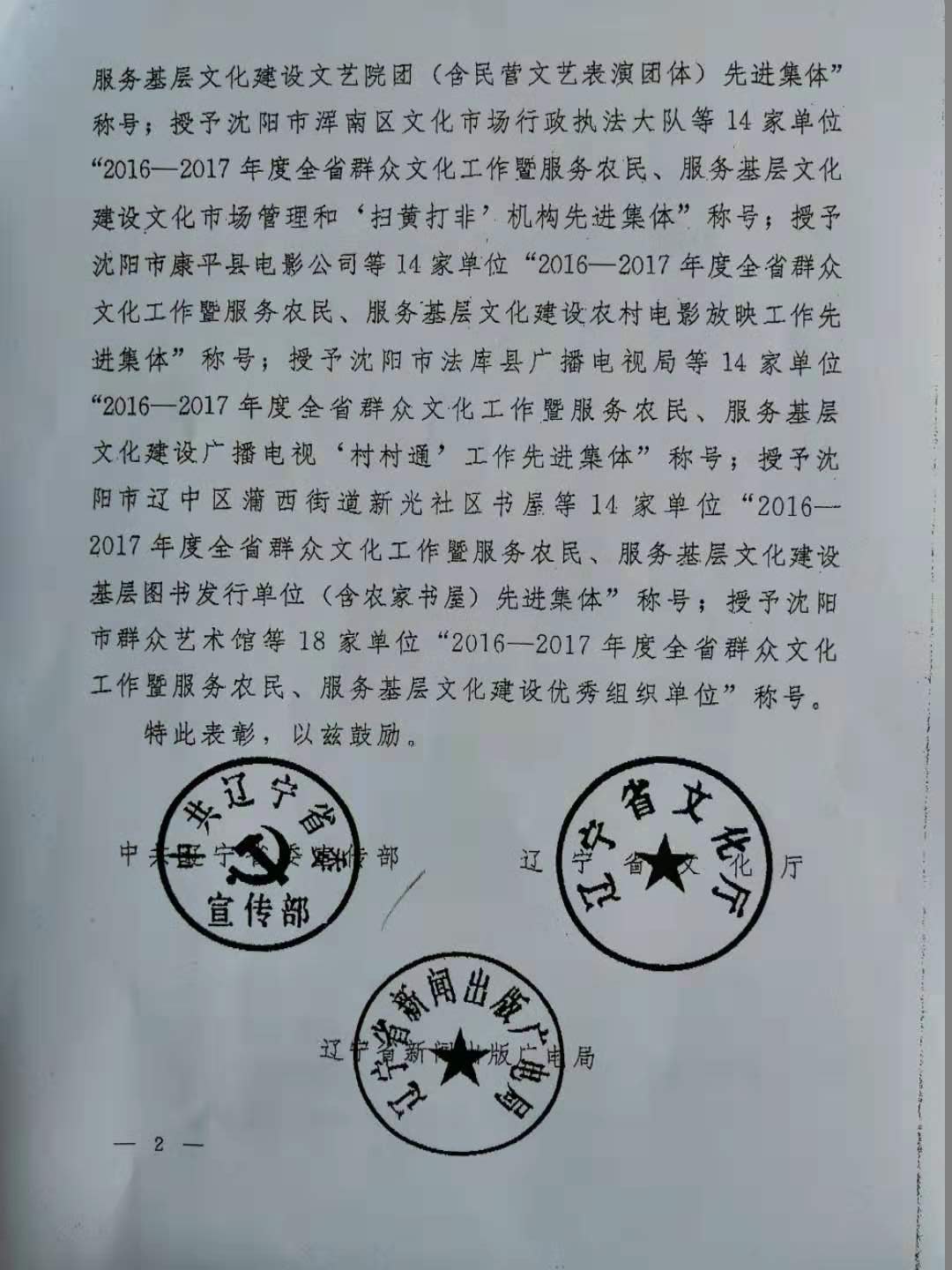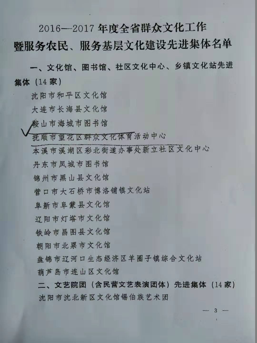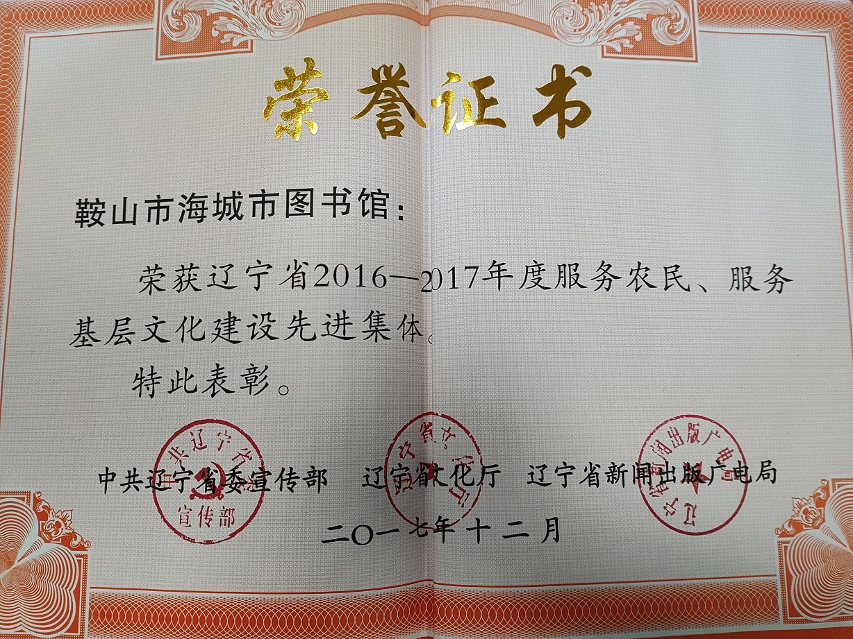 海城市图书馆荣获“辽宁省2016—2017年度服务农民、服务基层文化建设”先进集体