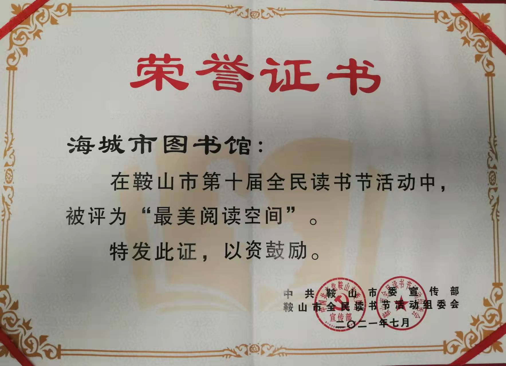 2021年7月荣获鞍山市第十届全民阅读活动—最美阅读空间