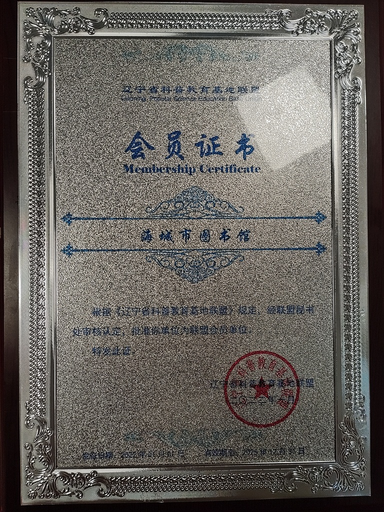 2022年1月 海城市图书馆荣获辽宁省科普教育基地联盟会员单位