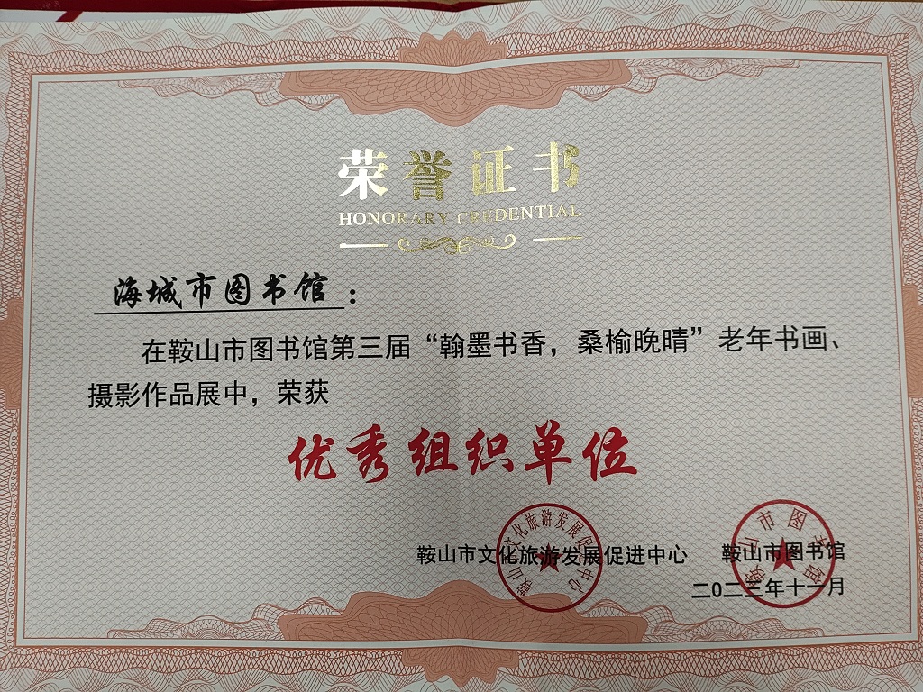 2023年11月荣获鞍山图书馆第三届“翰墨书香,桑榆晚情”书画摄影优秀组织单位