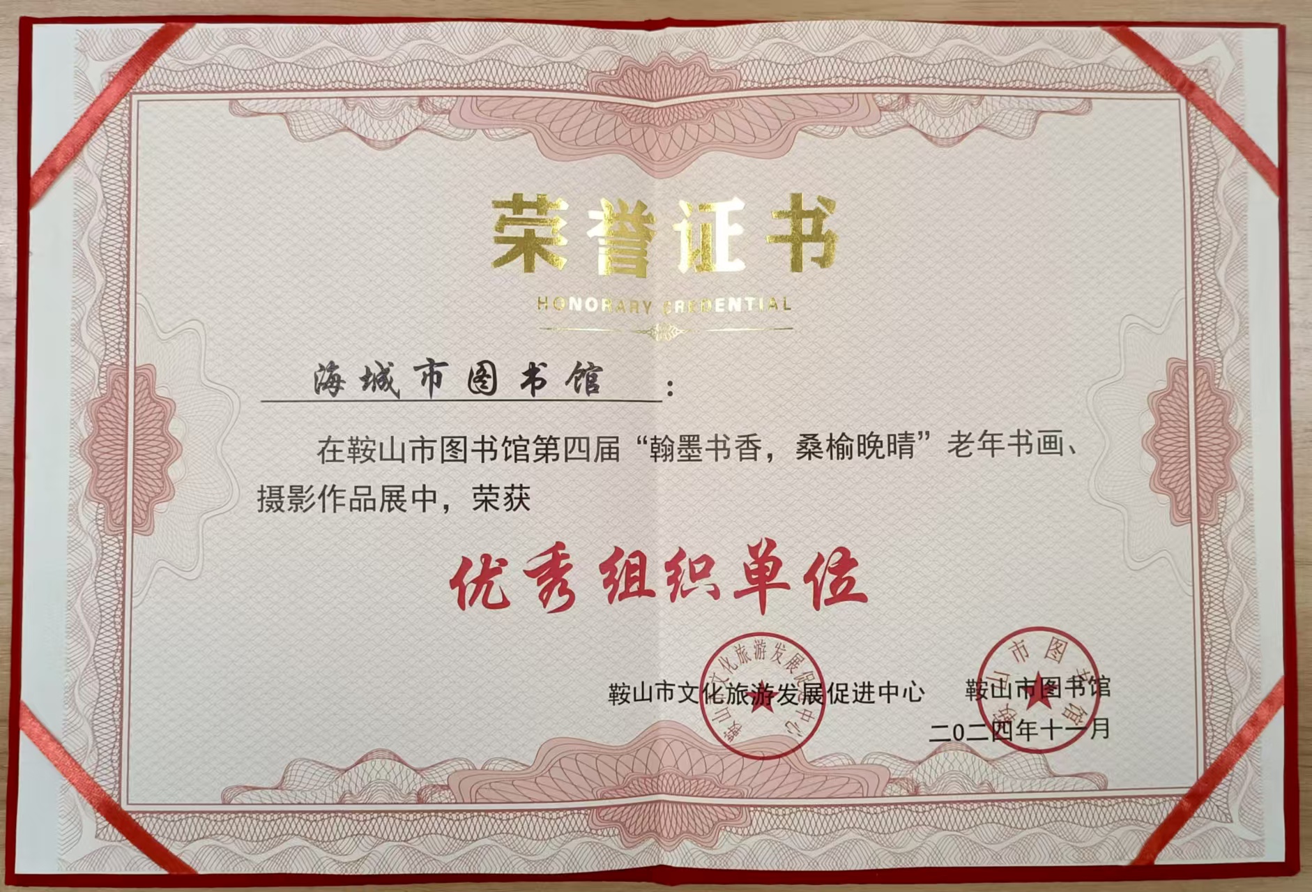 2024年11月荣获鞍山市图书馆第四届“翰墨书香 桑榆晚晴”老年书画展优秀组织单位奖