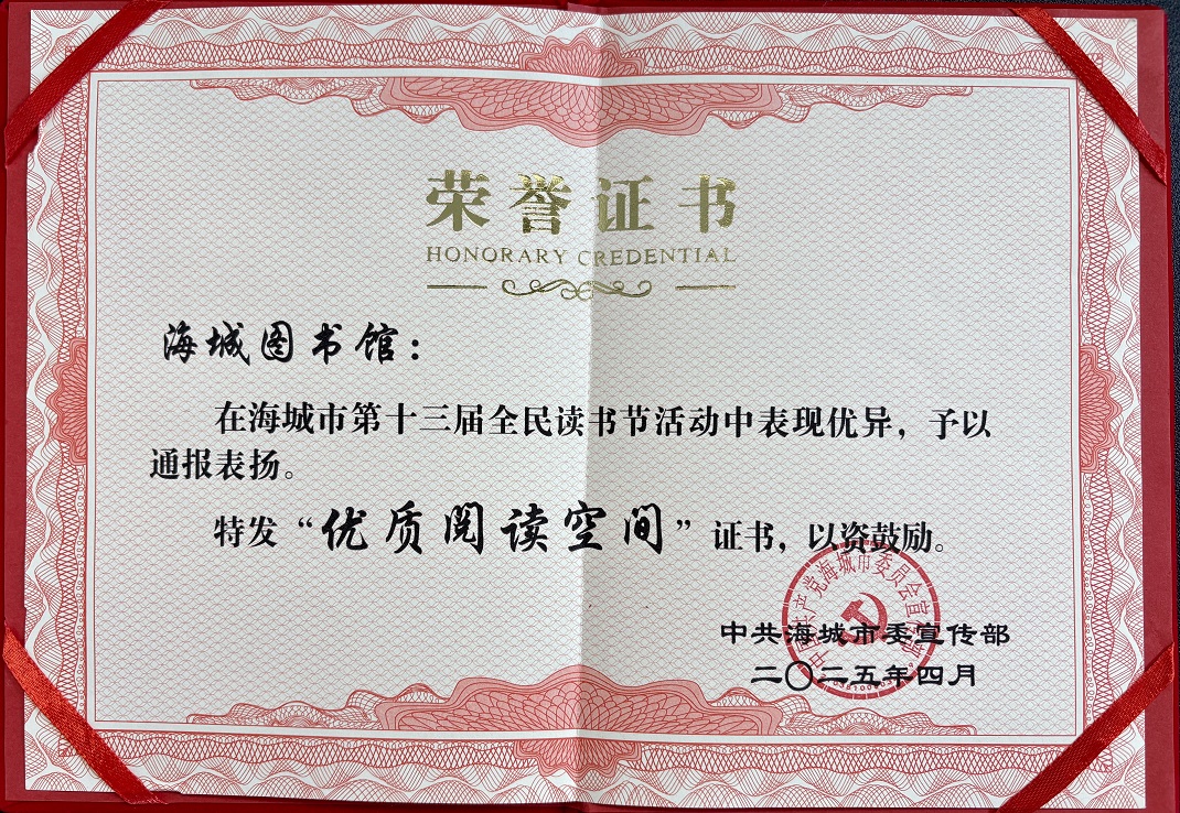 2025年4月海城市图书馆被海城市委宣传部评选为“优质阅读空间”